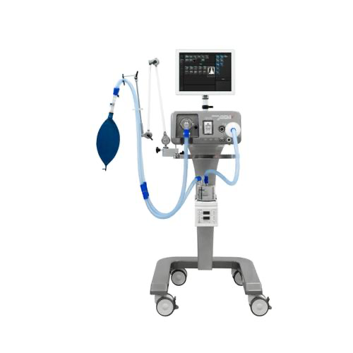 Прибор оборудован цветным сенсорным 15-дюймовым монитором, который легко поворачивается в нужную сторону и может крепиться отдельно от самого аппарата ИВЛ. Также в комплектацию входят: